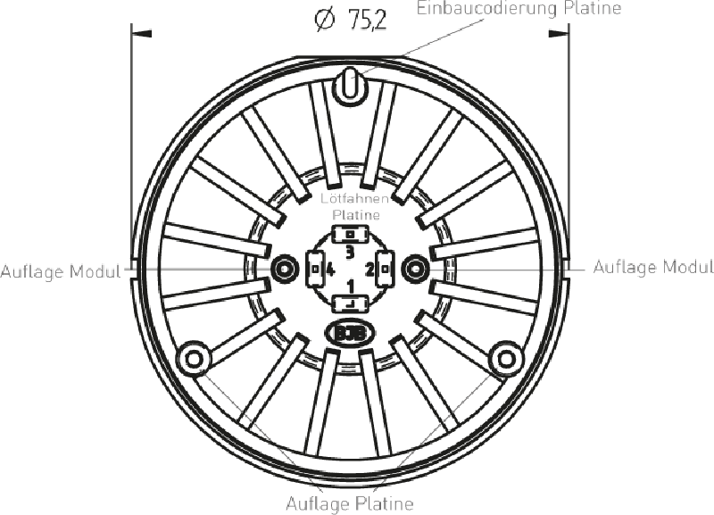 The top side of the base plate is provided with an assembly coding, contact surfaces and soldering lugs for a PCB. There are also contact surfaces for a module. (See drawing for details)