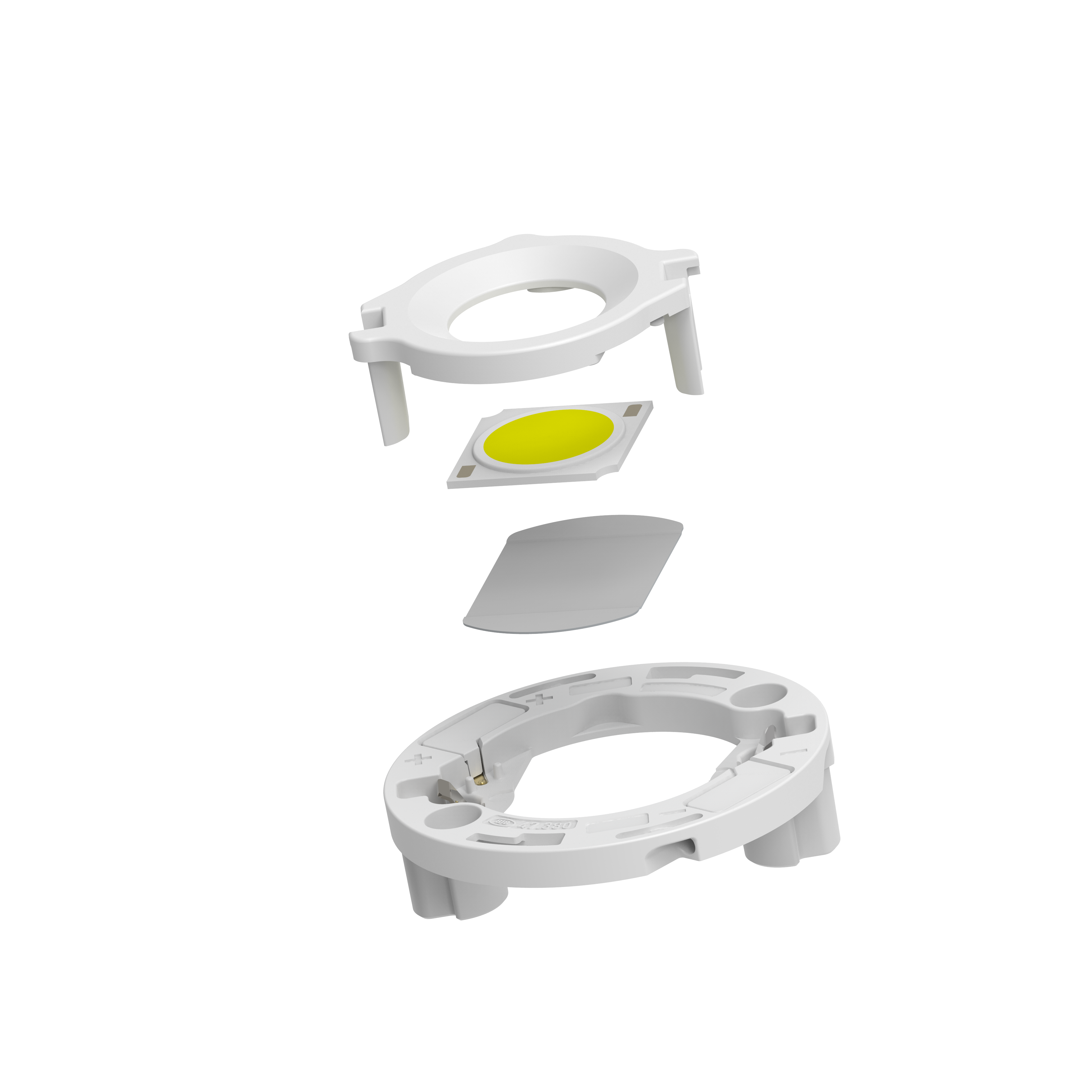 当社の革新的な接続システムにより、照明器具の組み立て中に COB の後付けや交換が可能になり、生産とメンテナンスにおいて最大限の柔軟性を実現しています。COB および TIM(熱伝導材料)用の交換可能な内部部品を備えたモジュラー設計により、設置と交換が簡単に行えます。13.5 x 13.5 mm、19 x 19 mm、20 x 24 mm サイズの COB をサポートしています。