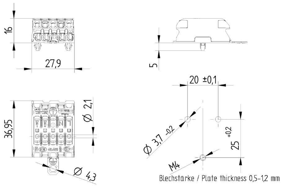 | Ausführung: | marking L N ⏚ DA+ DA- and earthing bracket |
