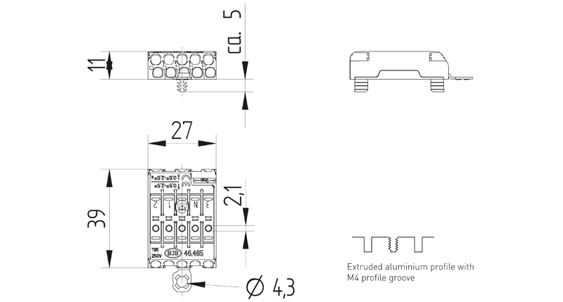 製品情報 "Flat Terminal block 5 poles with Earth bracket, snap-in pins Aluprofile 3NEZ12 and contact opening function"