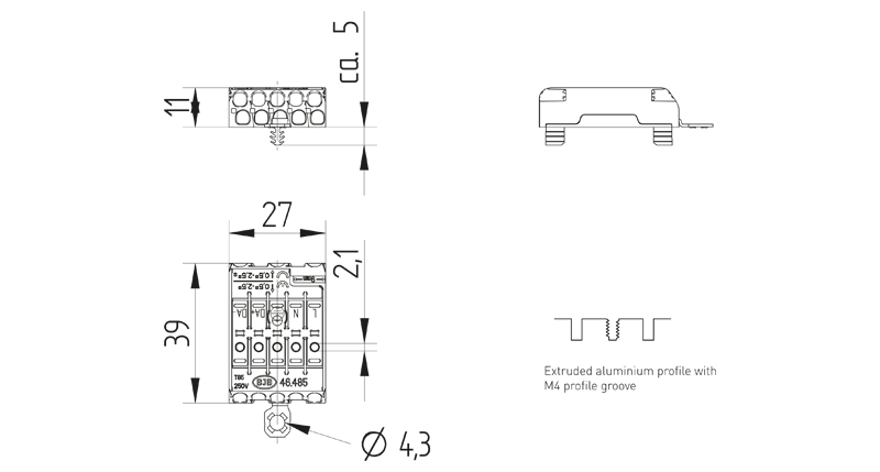 製品情報 "Flat Terminal block 5 poles with earth bracket, snap-in pins Aluprofile LNEZDA+DA- and contact opening function"