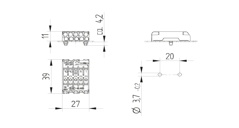 製品情報 "Flat Terminal block 5 poles with snap-in pins LNEZDA+DA- and contact opening function"