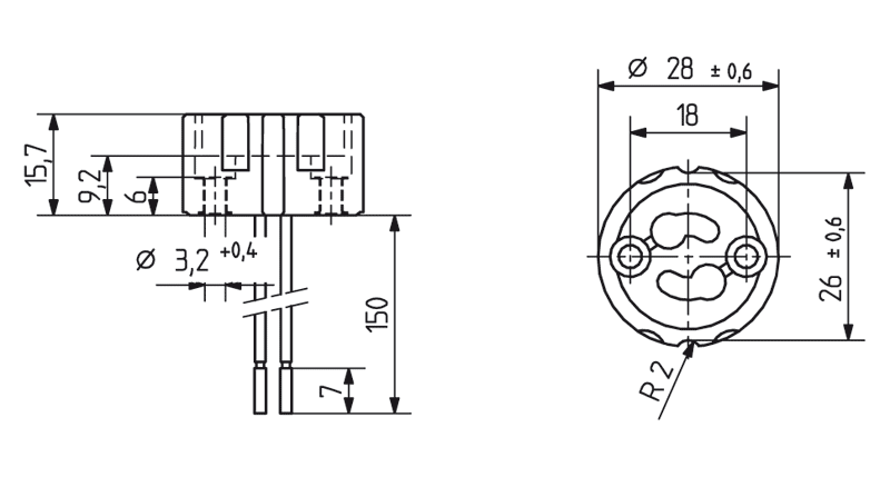 | Wires: | Cu. nickel, 0.75 mm², Insulation: PTFE (max. 250° C), with ferrule, Free cable length: 150 mm |