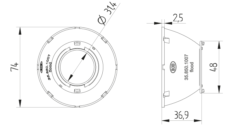 Reflector is optimized for use with connectors 47.319.2013 / 2021 / 2025 / 2026 / 2345 and 47.360.5010 with Ø 50 mm