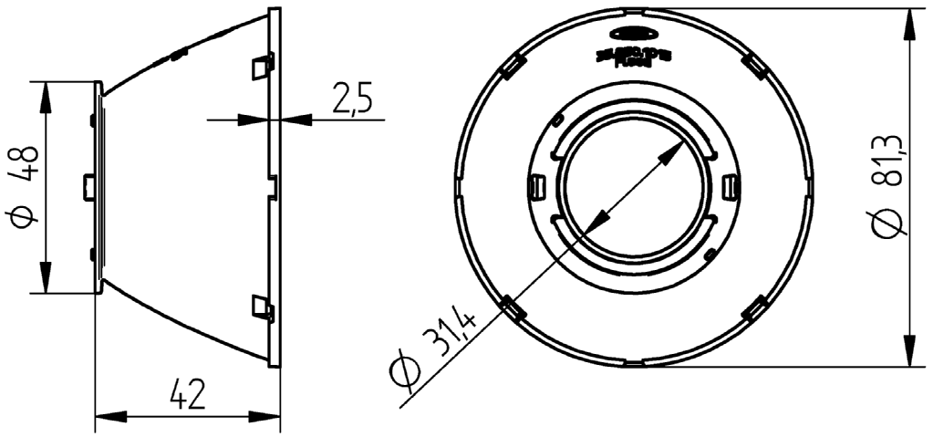 Reflector is optimized for use with connectors 47.319.2013 / 2021 / 2025 / 2026 / 2345 and 47.360.5010.50 with Ø 50 mm.