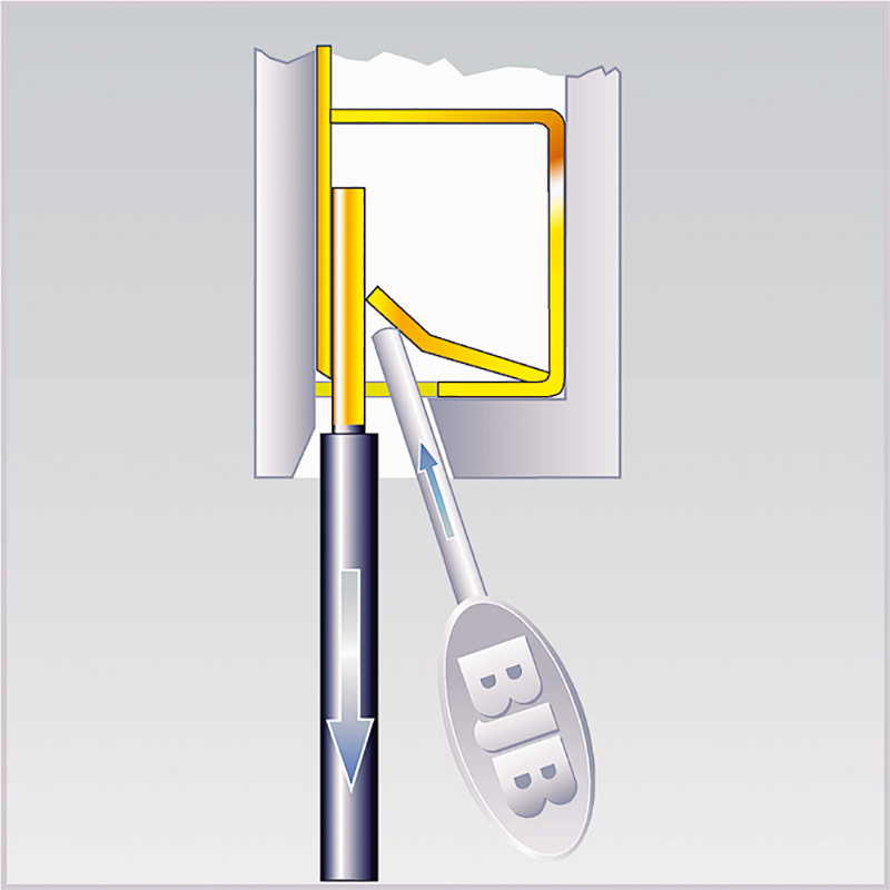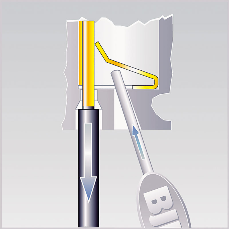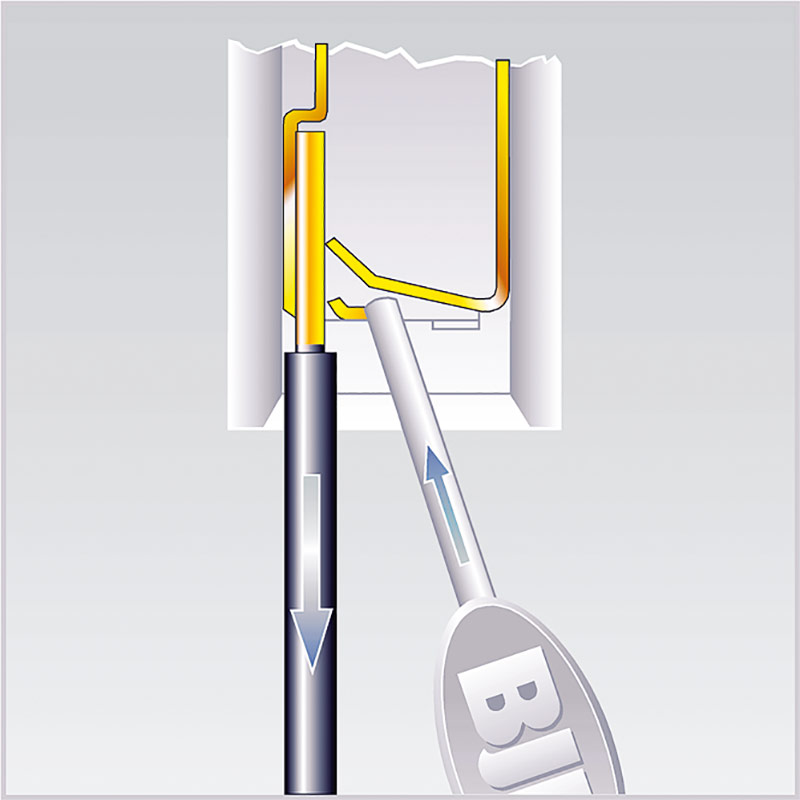 Pushwire contacts with a key or oval hole in the housing: The release probe, which we can gladly provide upon request, is placed behind the conducting wire, thereby opening the leaf spring. The wire can be pulled out. (when pressing the leaf spring down, extreme care must be taken in order that the contact does not become distorted)*.