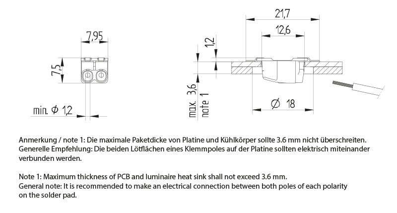 | Conductor cross-section: | Eindrähtige Leiter / Solid wires: 0.2 - 0.75 mm², AWG 24-18; Feindrähtige, verzinnte Leiter / Stranded, tinned wires: 0.2 - 0.5 mm², AWG 24-20; |