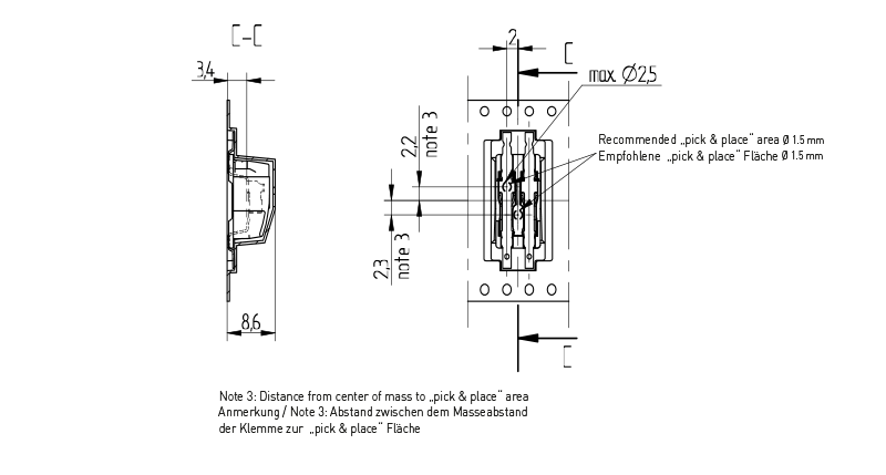 Suitable for leadfree-reflow-profiles according to DIN EN 61760-1 respective DIN EN 60068-2-58 up to peak-temperature of max. 260°C. Due to different application-specific parameters (component arrangement and alignment, soldering system, solder paste), it is recommended to use test runs to determine a suitable profile under production conditions.