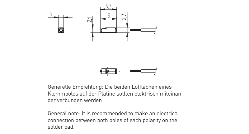 It is recommended to make an electrical connection between both poles of each polarity on the solder mask